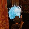 auf das Brett, an dem die bunte Lampe hängt. Dreh Dich um.