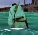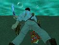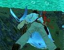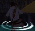 die Machete bereit und spring ins Wasser hinunter. Schwimm an den