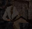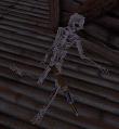 Skelett vor der Kiste hält eine Machete in der Hand. Mit der
