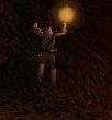 dem Gang, begleitet von Fackeln, die sich selbst entzünden.