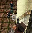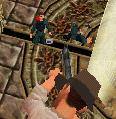 Du hast vier Gegner: Einer läuft auf dem Boden herum. Er hat ein Schrotgewehr und ist deshalb die grösste Gefahr. Die anderen drei sind oben auf den höheren Absätzen. Sie sind keine so grosse Bedrohung, ausser ganz zu Beginn.
